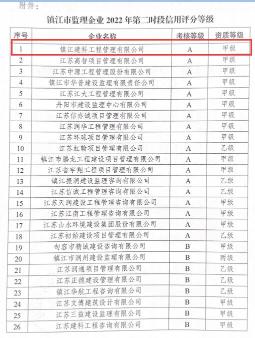 根據鎮江市住房和城鄉建設局2022年12月02日發布的關于開展鎮江市監理企業2022年第二時段信用分評價工作的通知(鎮建建管[2022] 103號),我公司按要求及時上傳了所需評價各類文件。本次考核評價主要包含企業基本信用分、納稅得分、在建項目綜合考核分和日?己朔炙膫部分。本次共有55家監理企業參與考核評價,比第一時段增加了3家參評單位。最終我公司得分102.75分,排名全市第一,繼續保持A類。我公司將以此次信用評價為動力,保持平常心態,不驕不躁,繼續深入掌握考核細則解讀,并以此促進我公司監理各項工作進一步落實、提高。