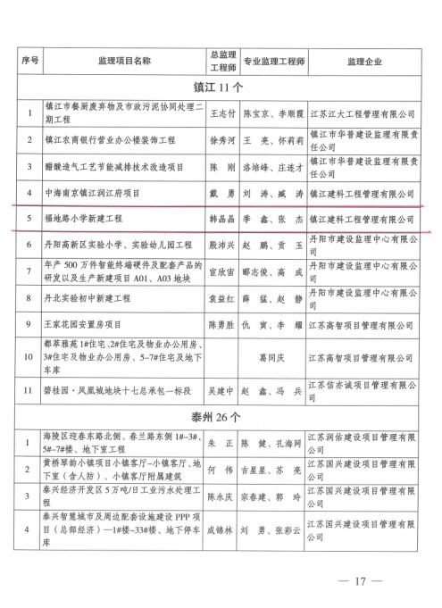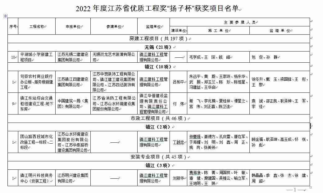 管理公司上半年喜獲2022年度江蘇省優質工程獎“揚子杯”5項,其中房建工程項目3項:無錫平湖城小學新建工程項目(管理公司承監的首個外地獲獎項目)、句容農村商業銀行辦公樓服務樓新建工程、鎮江東站綜合交通樞紐建設工程-地下車庫;市政工程項目1項:團山路西段城市化改造工程一標段、二標段工程;安裝工程項目1項:鎮江明興科技商務中心安裝工程。另外中海南京鎮江潤江府項目、句容福地路小學新建工程2個項目榮獲了2022年度江蘇省“標準化監理項目”,以上獲獎數量位居全市前列。