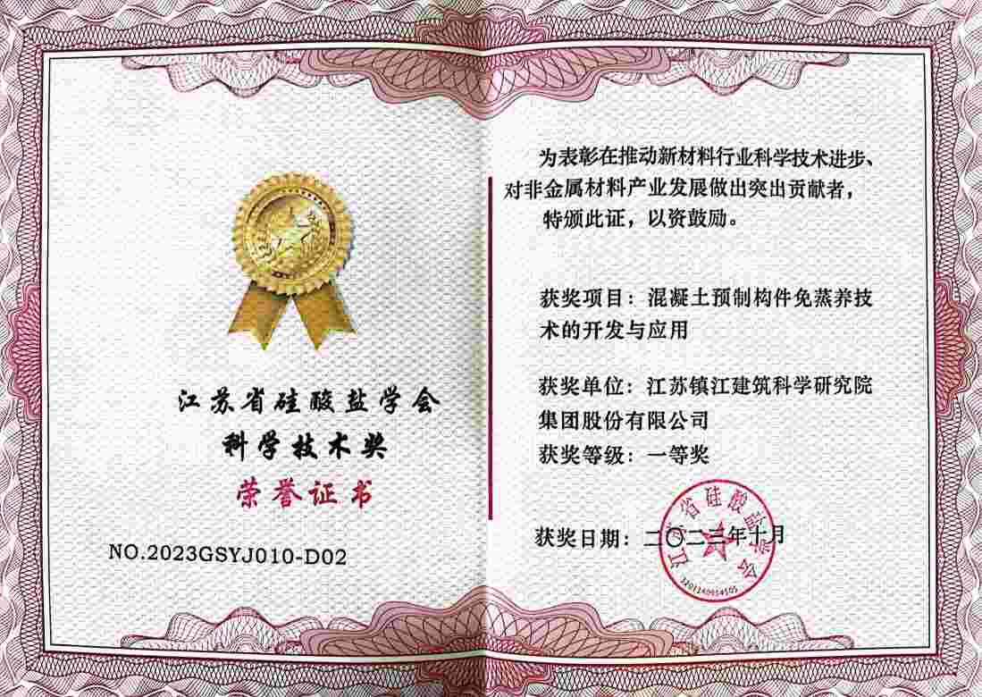 近日,江蘇省硅酸鹽學(xué)會(huì)成立60周年紀(jì)念大會(huì)在南京召開(kāi),我院受邀參會(huì)。會(huì)議公布了2023年度江蘇省硅酸鹽學(xué)會(huì)科學(xué)技術(shù)獎(jiǎng)獲獎(jiǎng)單位名單,并為獲獎(jiǎng)單位頒發(fā)了榮譽(yù)證書(shū),我院科技成果“混凝土預(yù)制構(gòu)件免蒸養(yǎng)技術(shù)的開(kāi)發(fā)與應(yīng)用”榮獲一等獎(jiǎng),陸小軍副院長(zhǎng)為第一申請(qǐng)人。頒獎(jiǎng)典禮上,繆昌文院士、劉加平院士等行業(yè)內(nèi)頂尖專家親自為獲獎(jiǎng)單位頒發(fā)了榮譽(yù)證書(shū),并對(duì)獲獎(jiǎng)單位表達(dá)了祝賀。