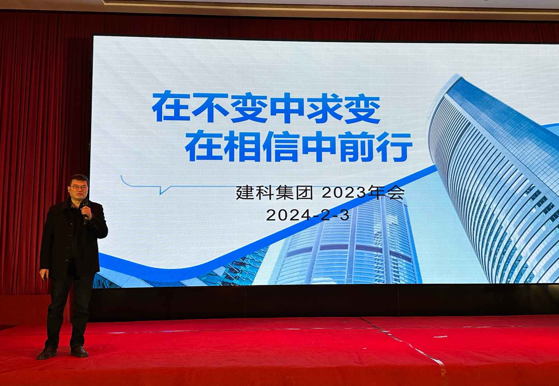 集團黨委書記、董事長伊立作題為“在不變中求變 在相信中前行”的年度總結報告。他首先回顧了“一半是海水、一半是火焰”無法描述的2023年,由衷感慨通過播放的2023大事記視屏充分說明建科集團2023年不忘初心、保持“管爾東西南北風”的定力,“歷經風雨更有晴”:建科集團的整體工作穩中有進,取得的成績是難能可貴的。展望2024年,董事長提出了“穩中求進 健康發展 發憤圖強 順勢有為”的工作方針,強調發憤圖強的“強”就是要科技強、人才強;他希望全體建科人面對“無法預測、一切皆有可能”的2024年,盡最大努力做好我們自己的事,不抱怨、不躺平、不懈怠、不畏難,在健康發展的道路上行穩致遠,蓄力向前。